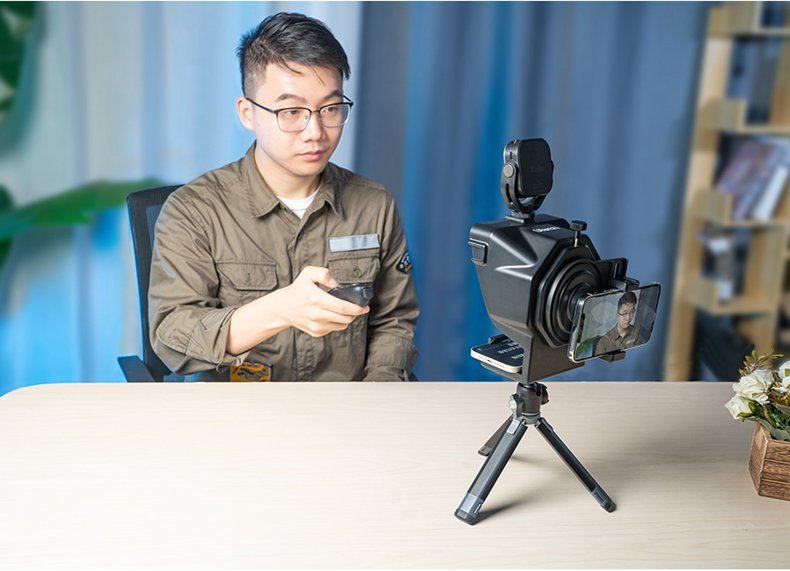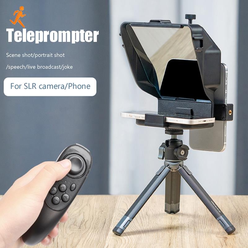 The ULANZI PT-15 for Camera and Smartphone fits the bill. Designed to use your smartphone, from 2.2 to 3.5″ wide, for the prompting text, you can mount this prompter on your DSLR or mirrorless camera lens using the included adapter rings, or on your smartphone, with the included smartphone expansion board. An included Bluetooth remote enables you to control optional prompting software of your choice.
